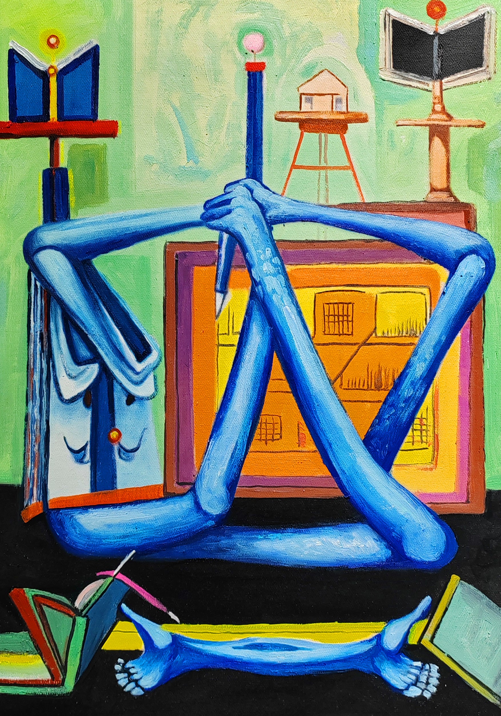 Midt i et rum af symboler, bøger, tårne, lamper og vinduer, snor blå lemmer sig sammen i en mærkelig form. De ligner både arme og ben, der tegner, skriver og skaber. Figuren sidder på en skærmagtig struktur, hvor felter med linjer minder om diagrammer eller arkitekturtegninger. Det er som om kroppen selv er blevet til et instrument, fanget i evig kreativ udfoldelse.
