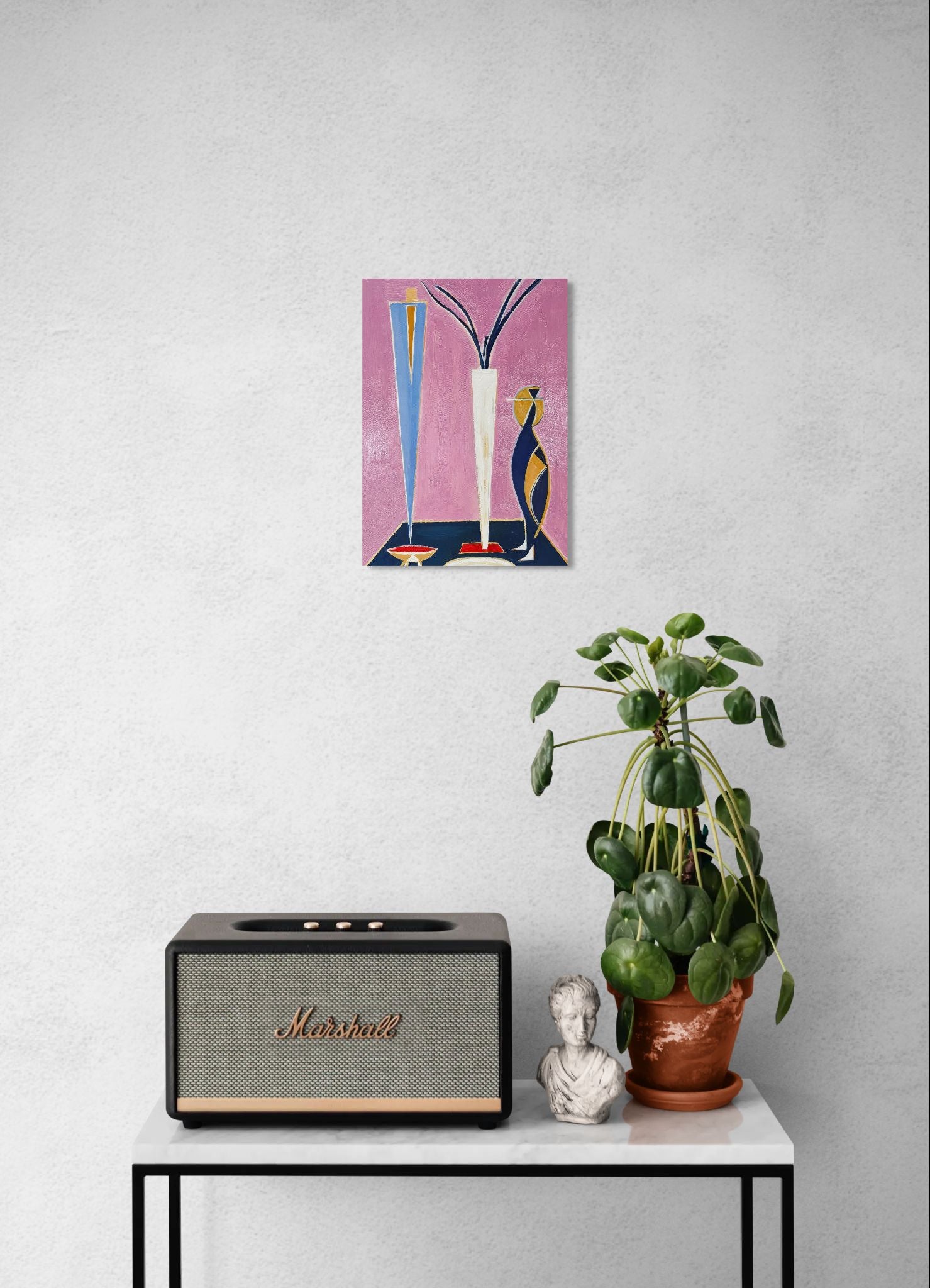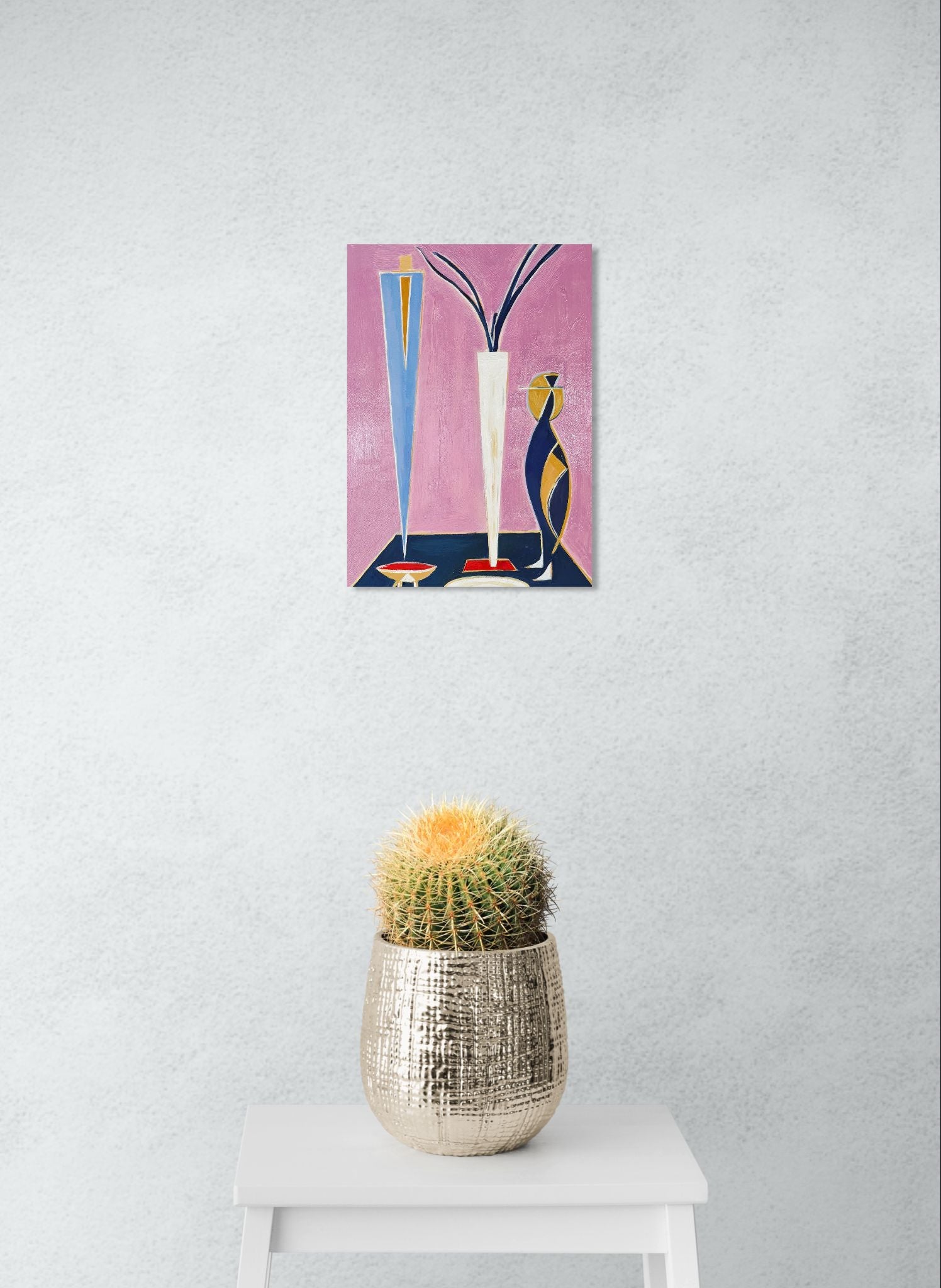 En række former står i dialog på en dyb rosa baggrund. Treenigheden af vaser og figurlignende objekter skaber et spil mellem vertikale, skrå og buede linjer, hvor det sorte og gule bryder frem som kontrapunkt.