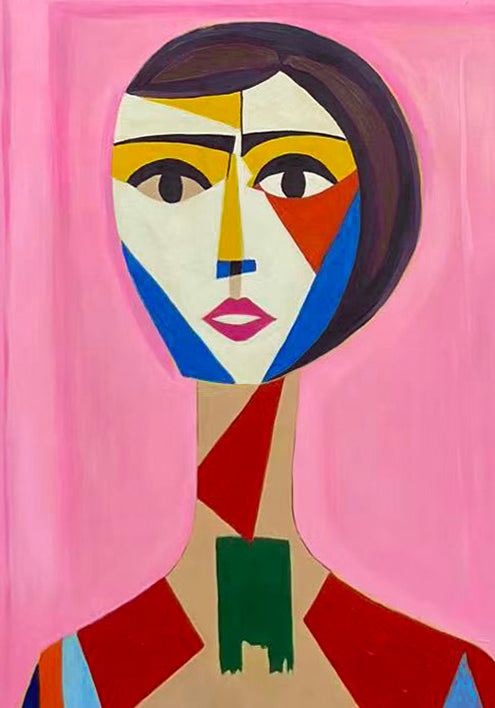 Ansigtet fremstår som en mosaik af farver – en visuel konstruktion snarere end et portræt. De klare, kantede felter i blå, rød og gul står i skarp kontrast til hudtonens neutralitet.