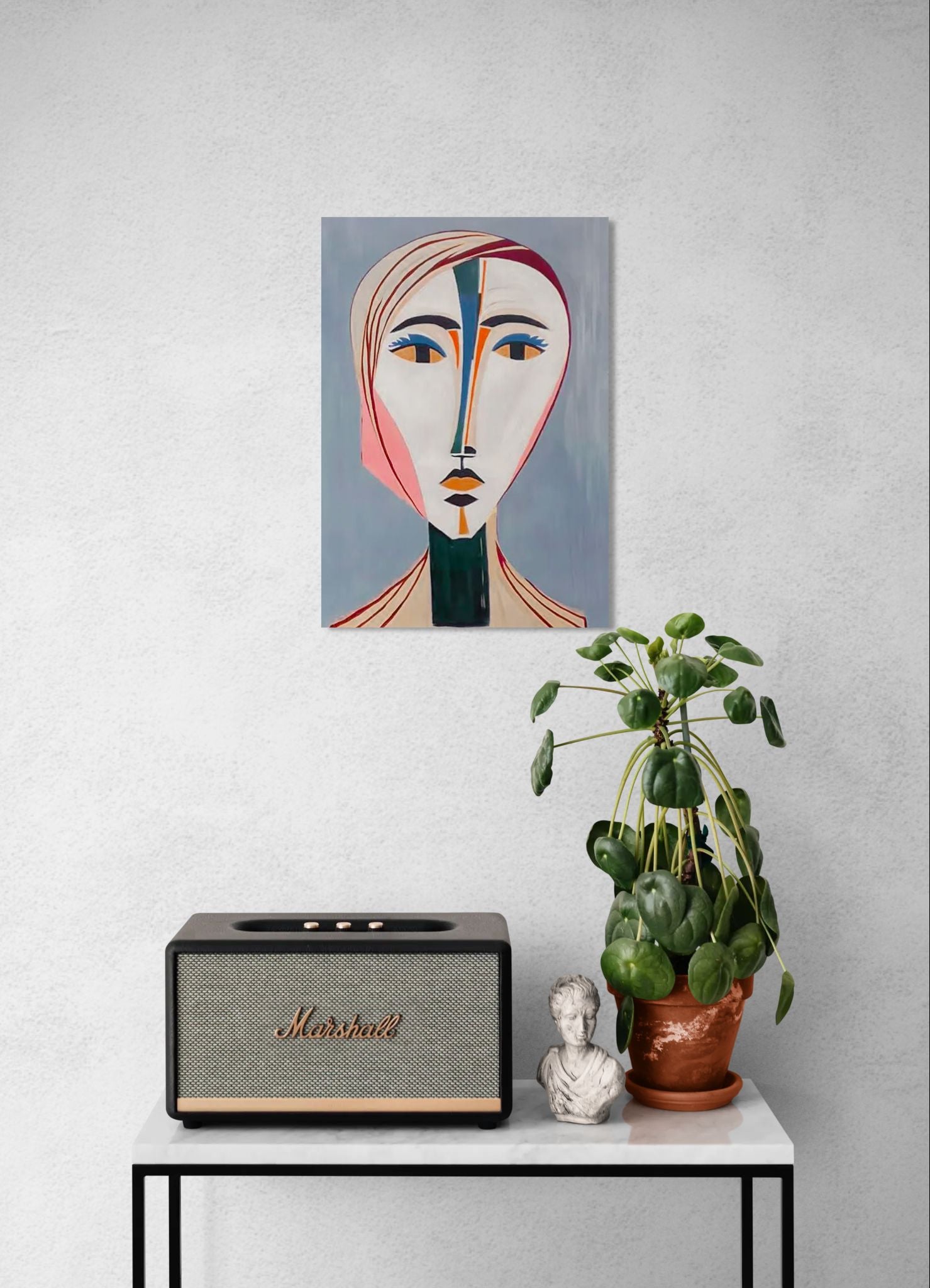 Et langt ansigt med geometriske træk udtrykker ro og eftertænksomhed. De enkle farvevalg understreger en stille værdighed, mens baggrunden fremhæver portrættets intense blik.