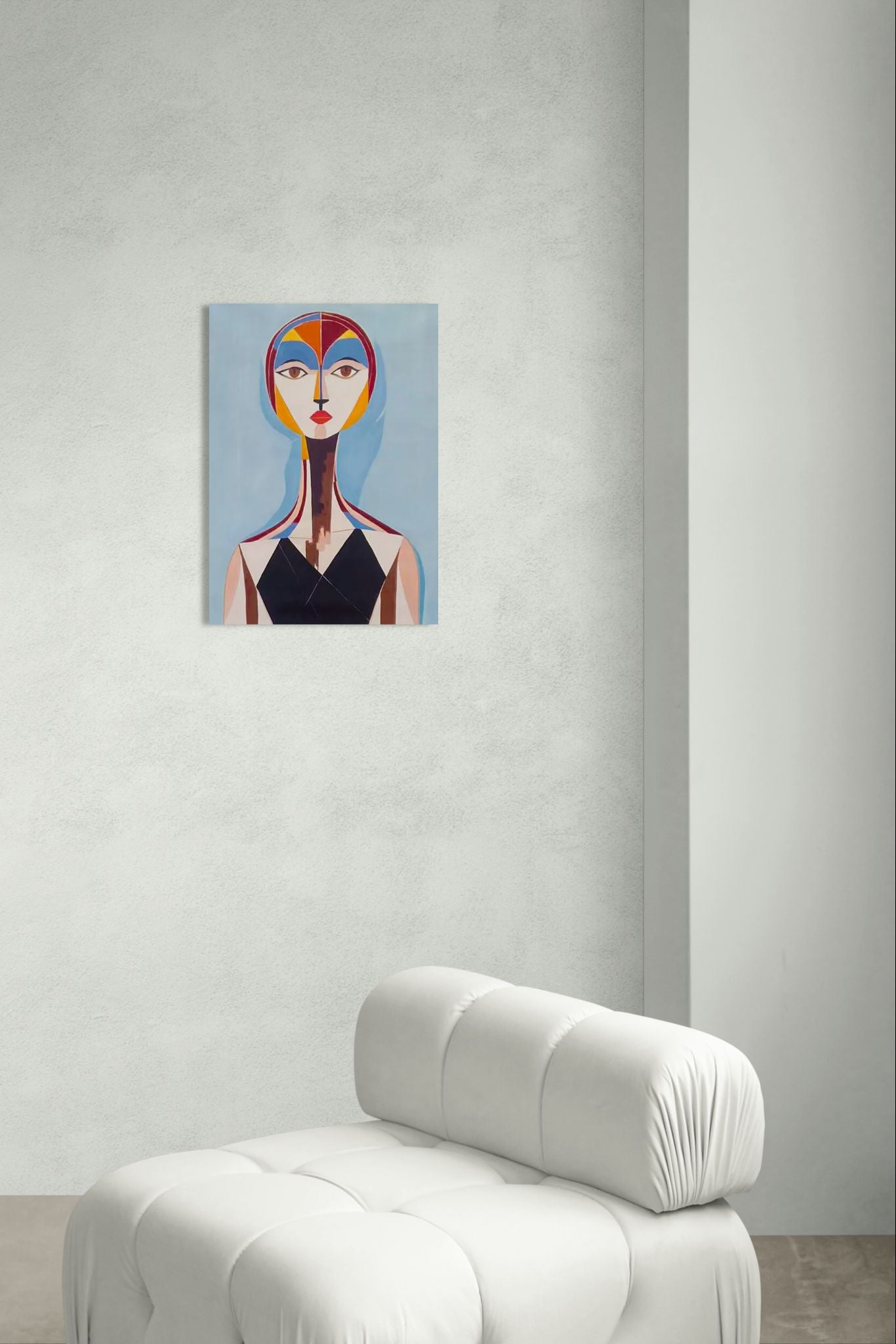 Her transformeres figuren til et nærmest kosmisk væsen. Ansigtets gyldne og blå felter reflekterer himmel og stjerner, mens proportionerne understreger en monumental tilstedeværelse.