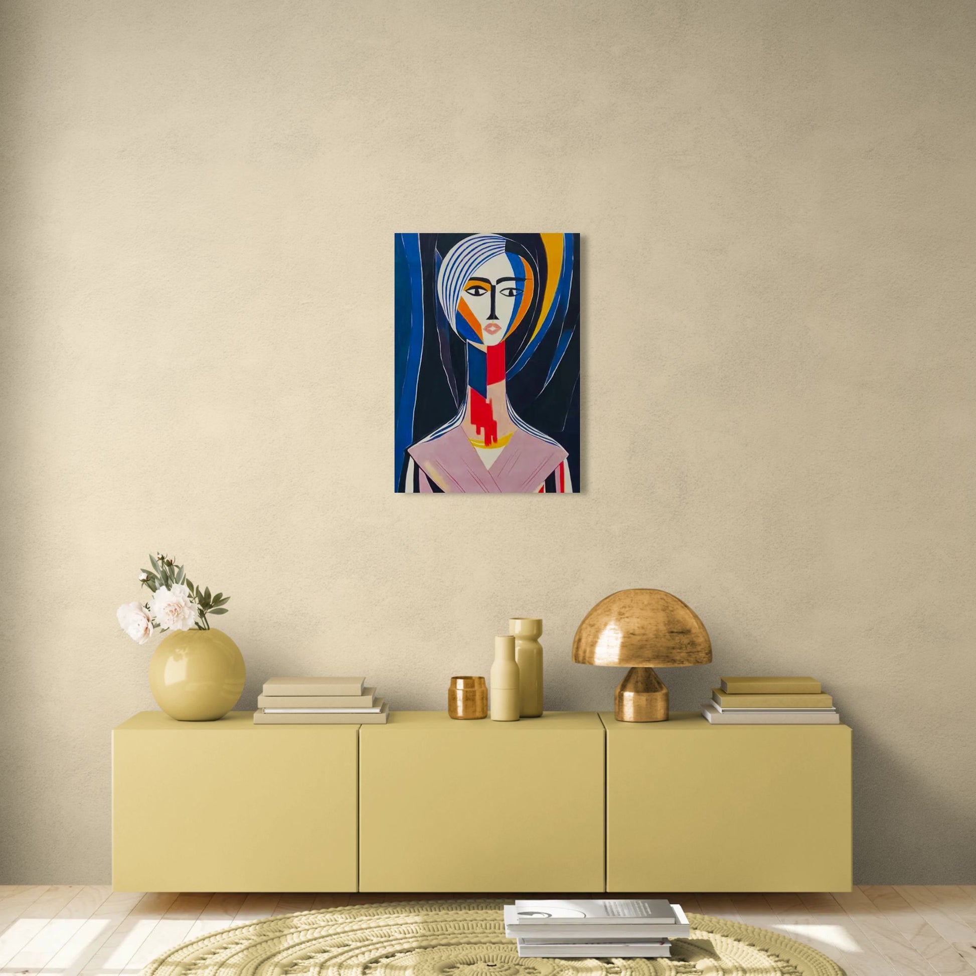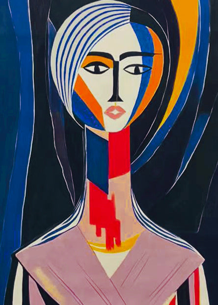Et portræt bliver her til en visuel konstruktion. De farvede felter bryder ansigtet op, mens blikket fastholder en kølig ro.