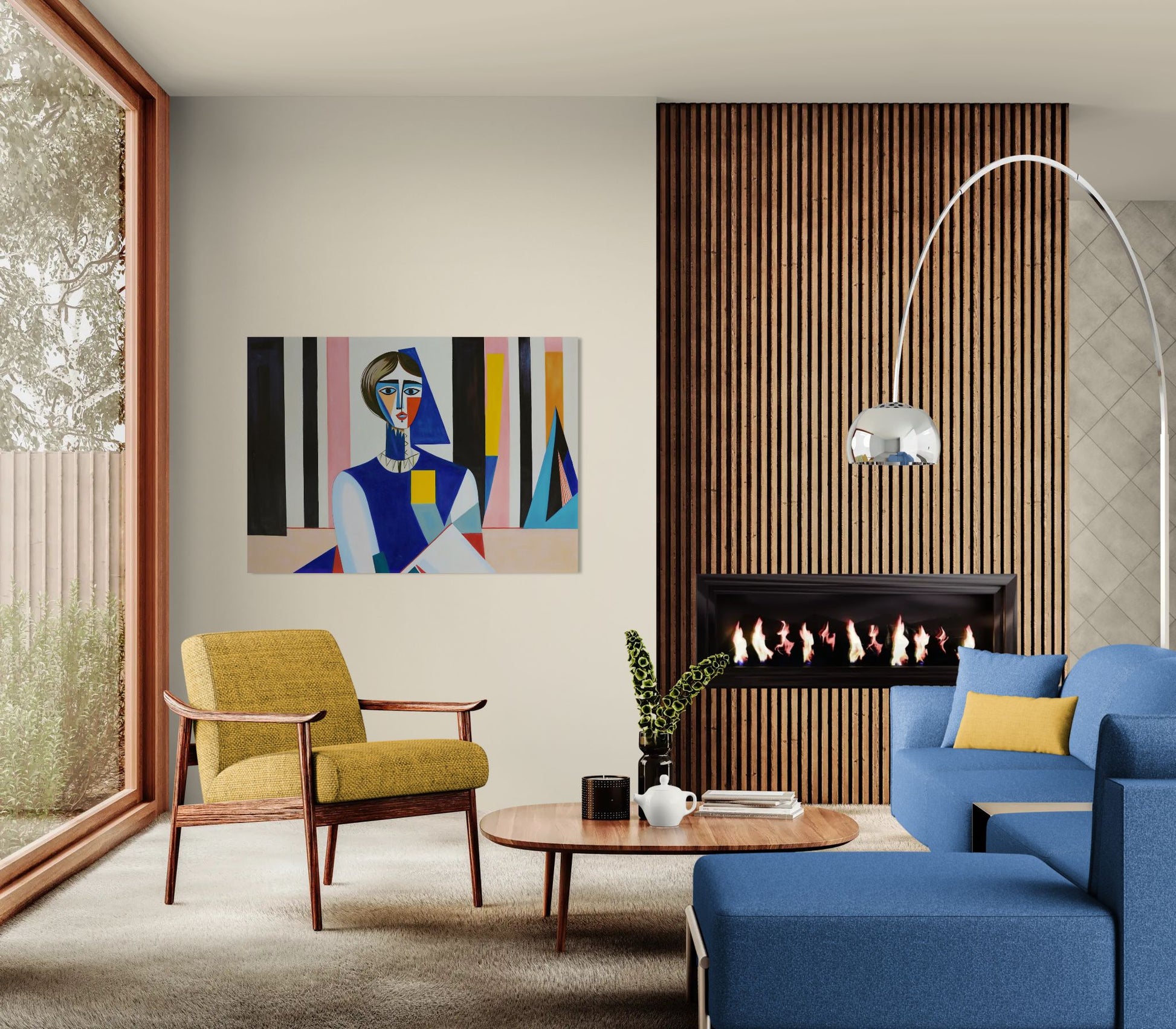En figur tegnes op af klare, geometriske mønstre, der næsten opløser kroppen til abstraktion. De skarpe linjer i kjolen og ansigtets farvefelter peger på et menneske, der bliver ét med kompositionen.