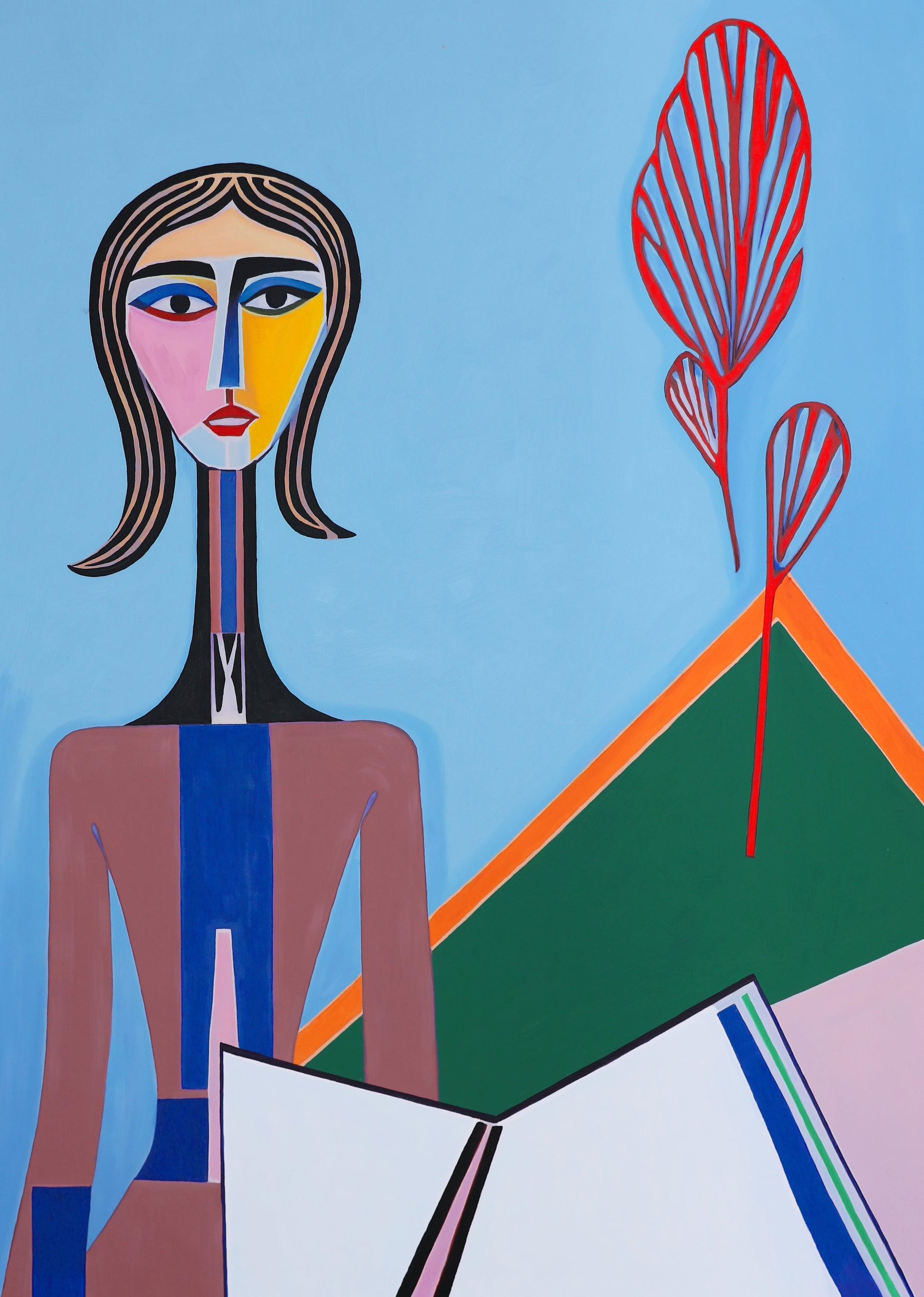 En figur sidder foran en stiliseret natur, hvor geometriske former peger på landskab og organiske rytmer. Ansigtet står i kontrast til de klare former, men synes også at spejle deres logik.