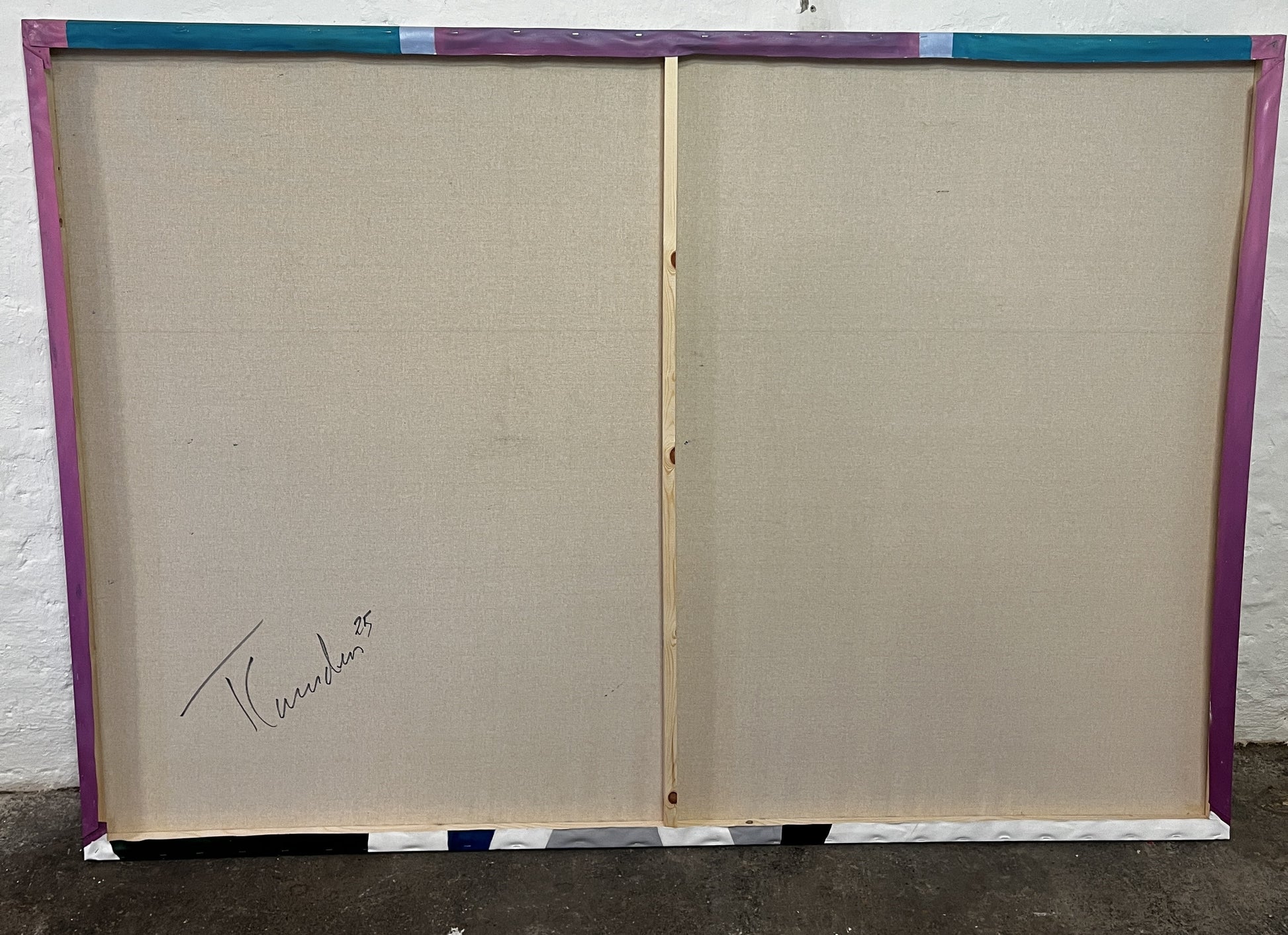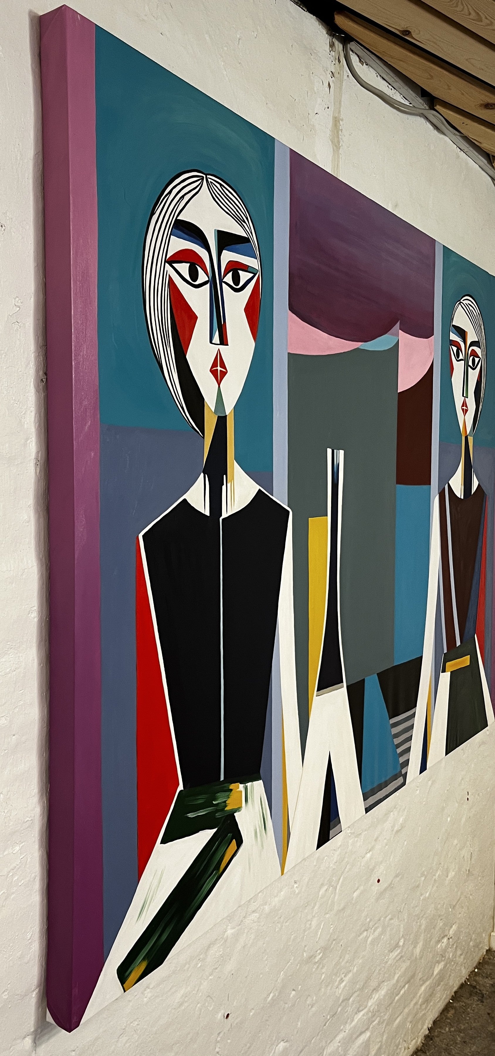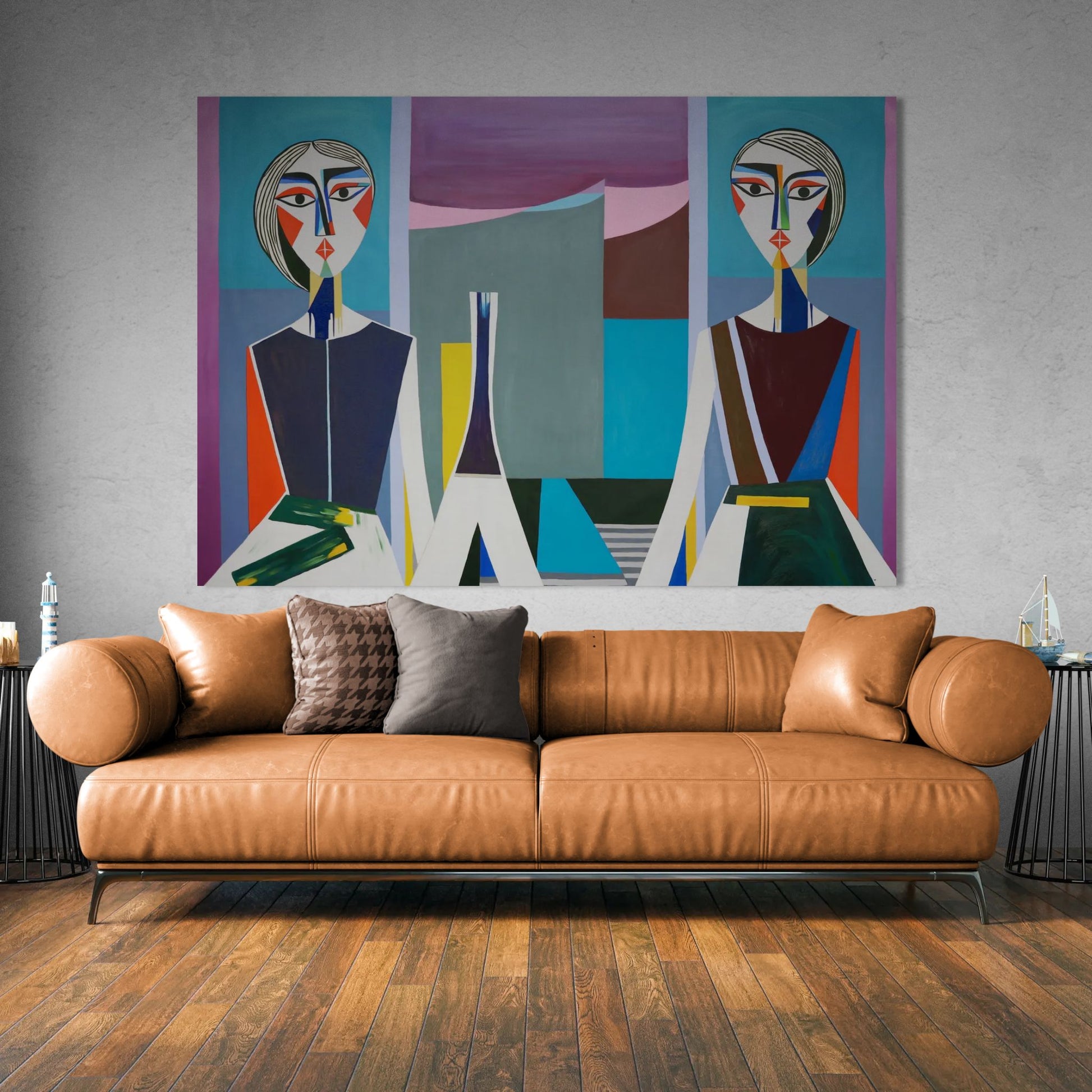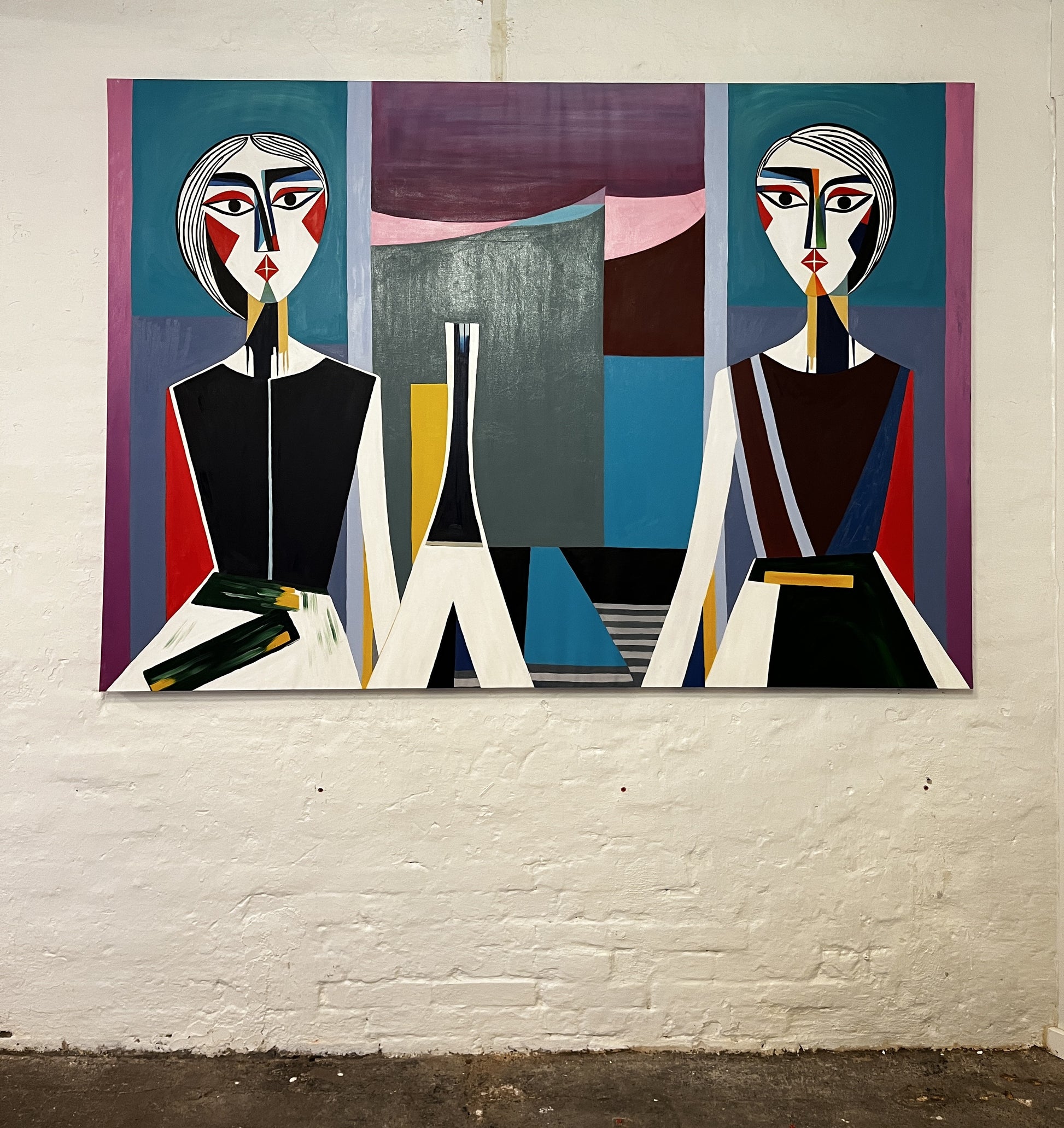 Her mødes to næsten tvillingelignende kvinder i en stramt komponeret scene. De sidder frontalt, symmetrisk placeret, men med små forskelle i farvefelter og kropsholdning. Baggrunden, der består af geometriske blokke i blå, lilla, grøn og rosa, understreger dualiteten og spejlingen.