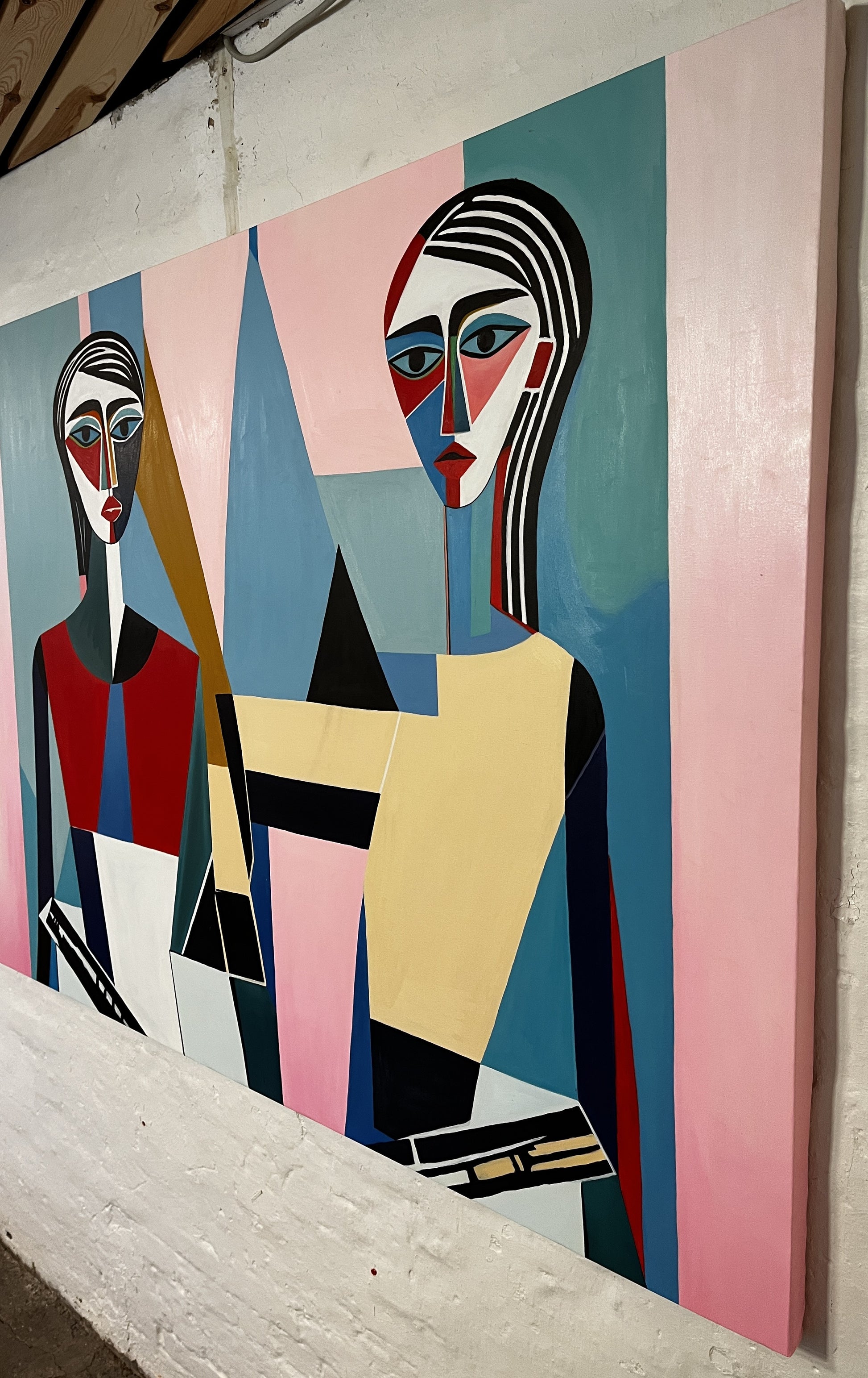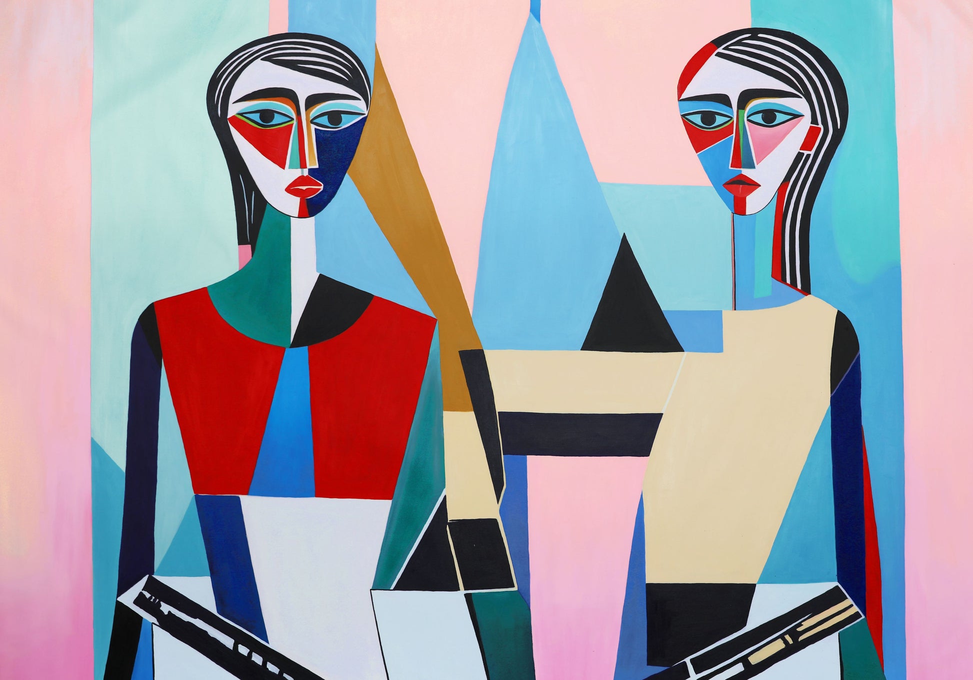 Baggrunden er geometrisk opdelt, hvilket skaber en rytmisk balance mellem figurerne og omgivelserne. Blikkene er rettede fremad, alvorlige og introspektive, som om de deler en stille samtale.