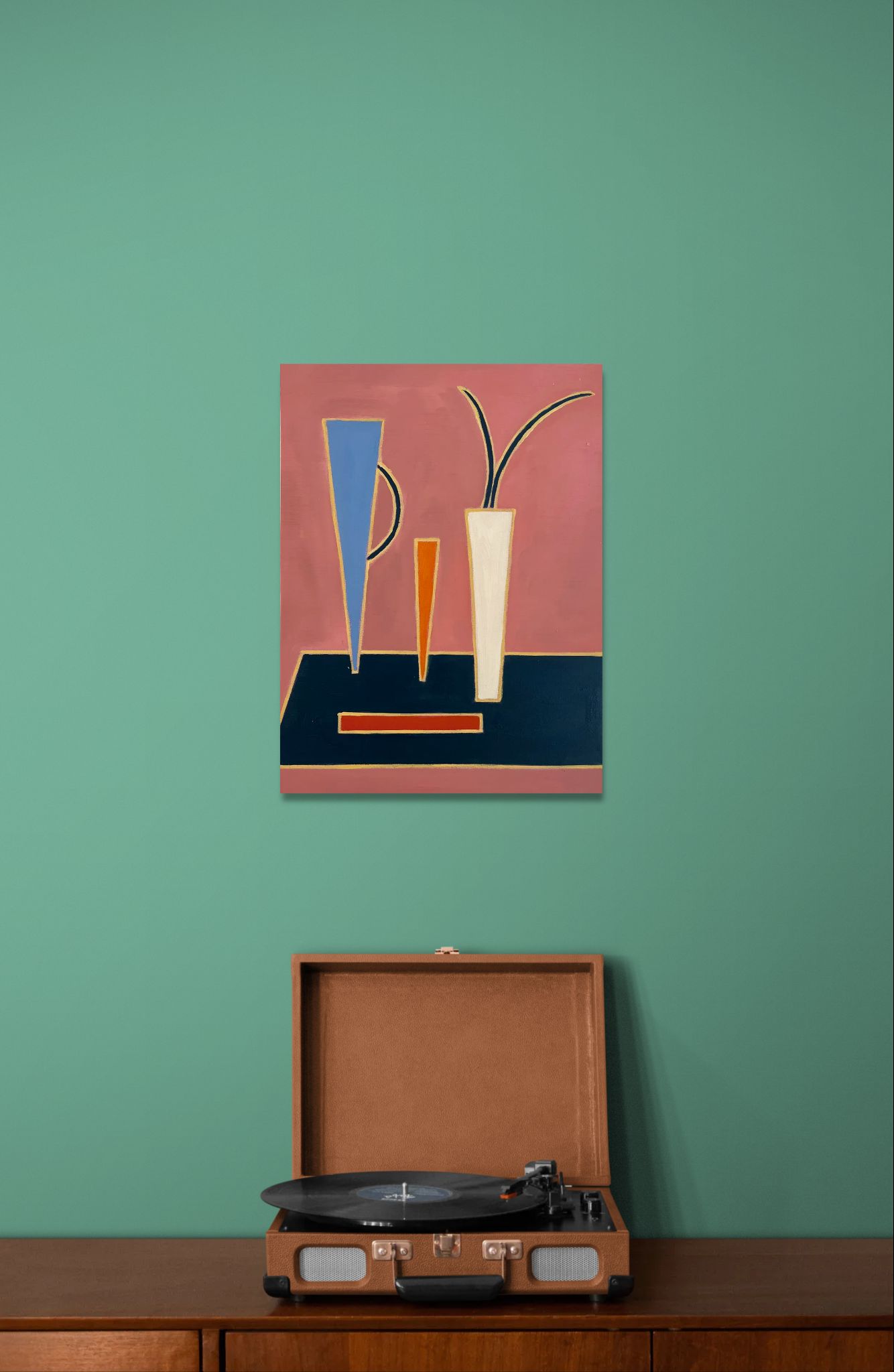 Et stiliseret og grafisk stilleben, hvor balancen mellem form og farve står i centrum. Værket er komponeret med skarpe silhuetter og kontrasterende farver, der trækker på inspiration fra Art Deco og modernistisk design. Den rosa baggrund skaber en rolig base for en stram opstilling af former – en blå kande, en slank orange form og en hvid vase med ekspressive strå – placeret på en dyb sort flade.
