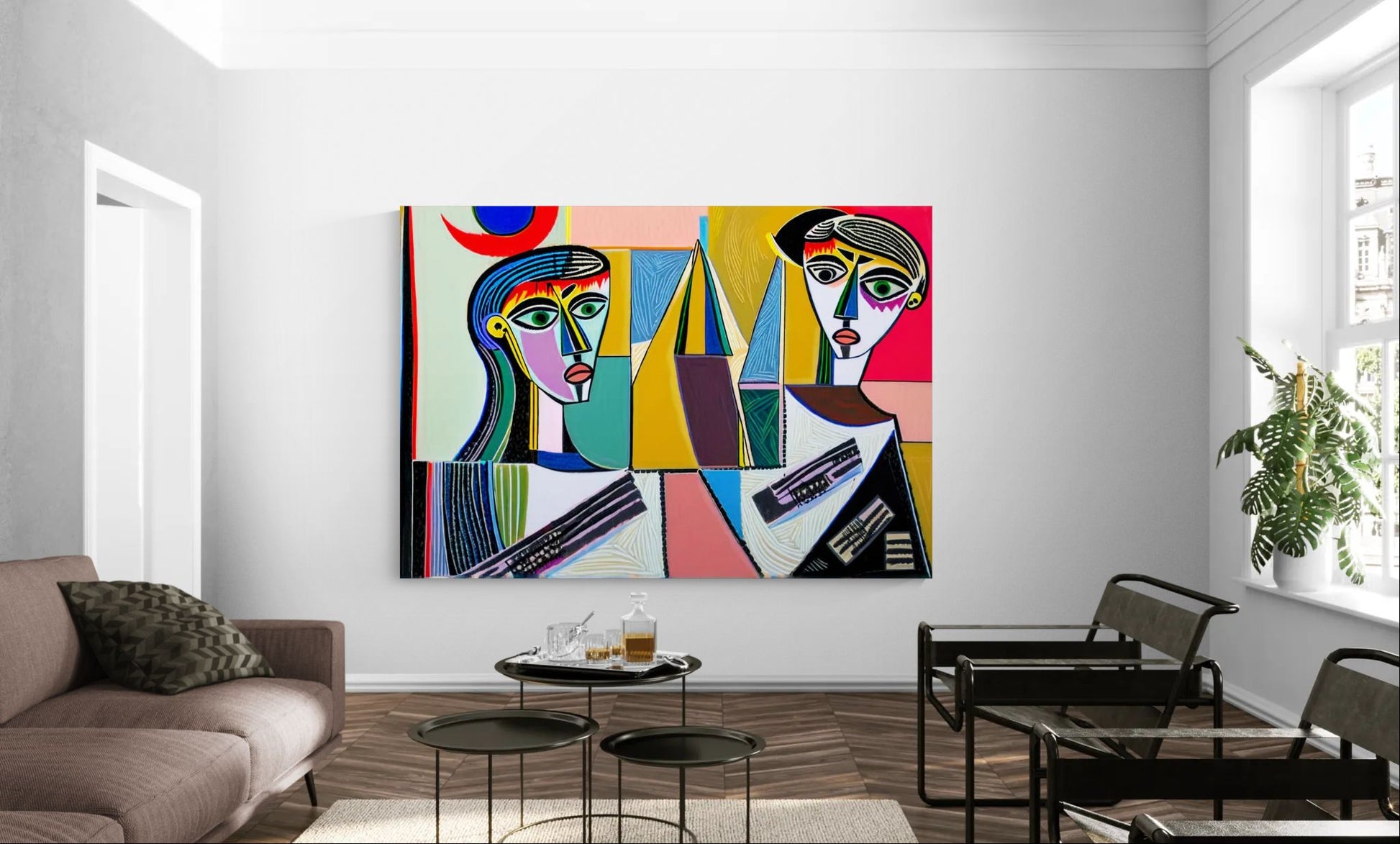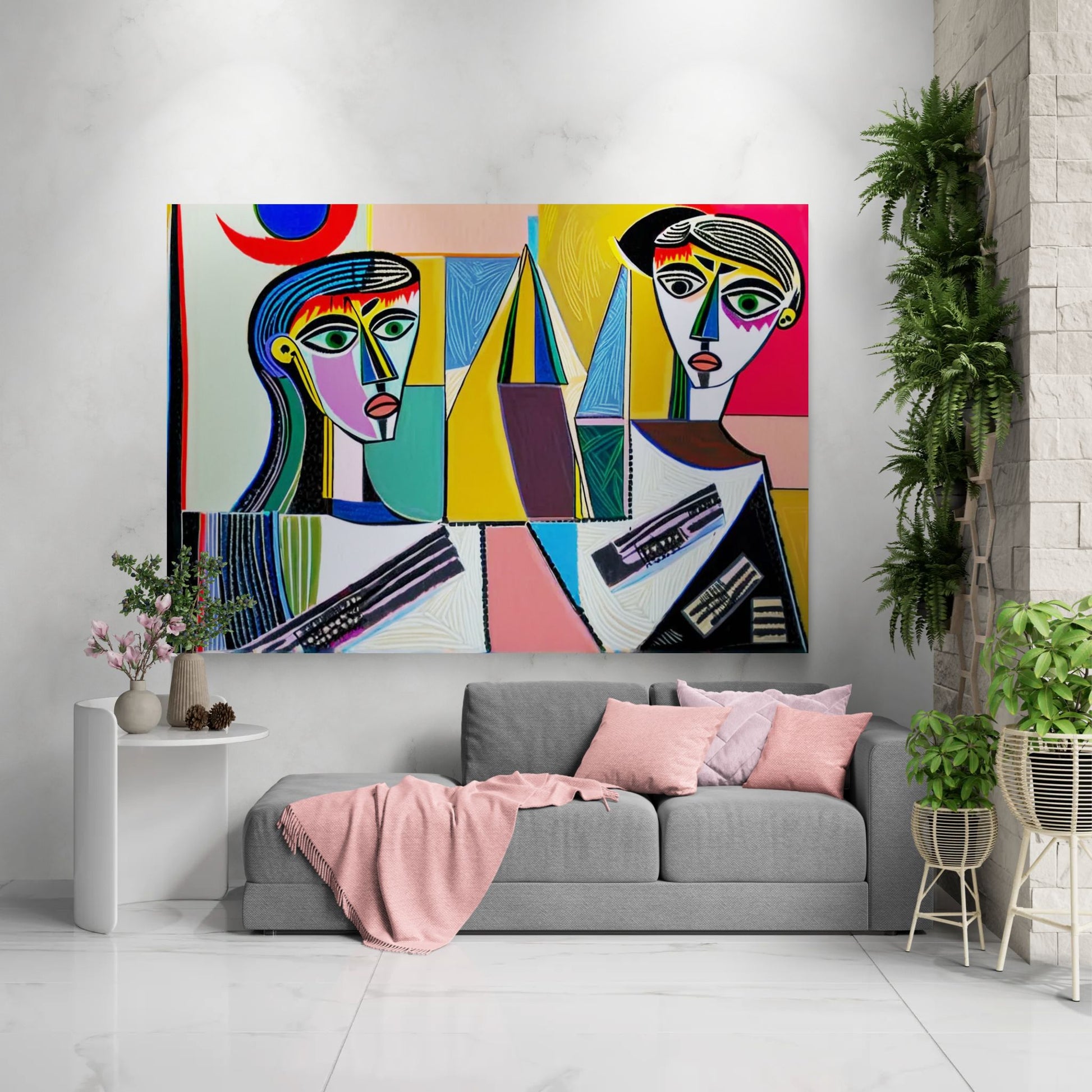 Et dobbeltportræt fyldt med energi og grafisk dynamik. De to figurer spejler og udfordrer hinanden i farve, udtryk og form, hvilket skaber en levende fortælling midt i et stramt geometrisk univers. Et stærkt statement-piece med stor rumlig virkning.