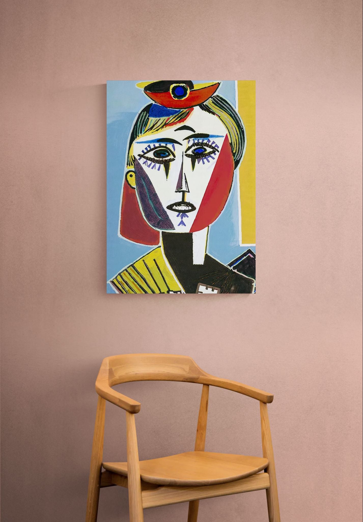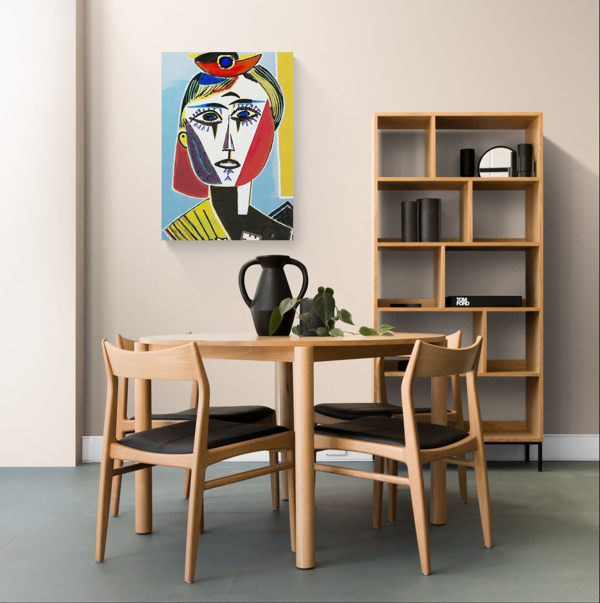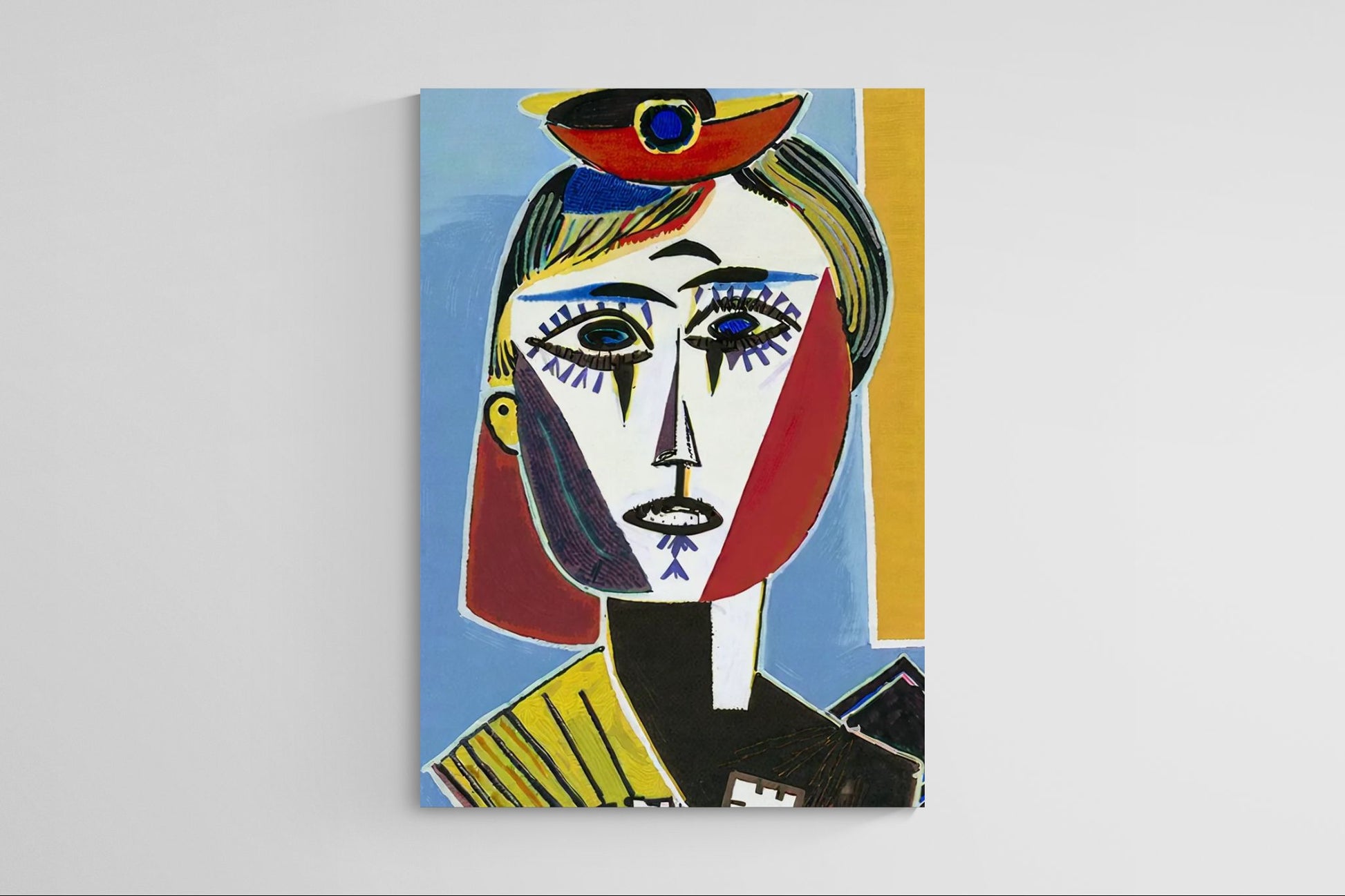 Et kraftfuldt kubistisk portræt, hvor den lille røde hat og de grafiske vifteformer omkring skuldrene tilfører en legende energi. De skarpe kantede skygger omkring øjnene giver figuren intensitet, mens farvevalget blander varme og kølige nuancer i perfekt balance. Et værk med tydelig modernistisk kant.