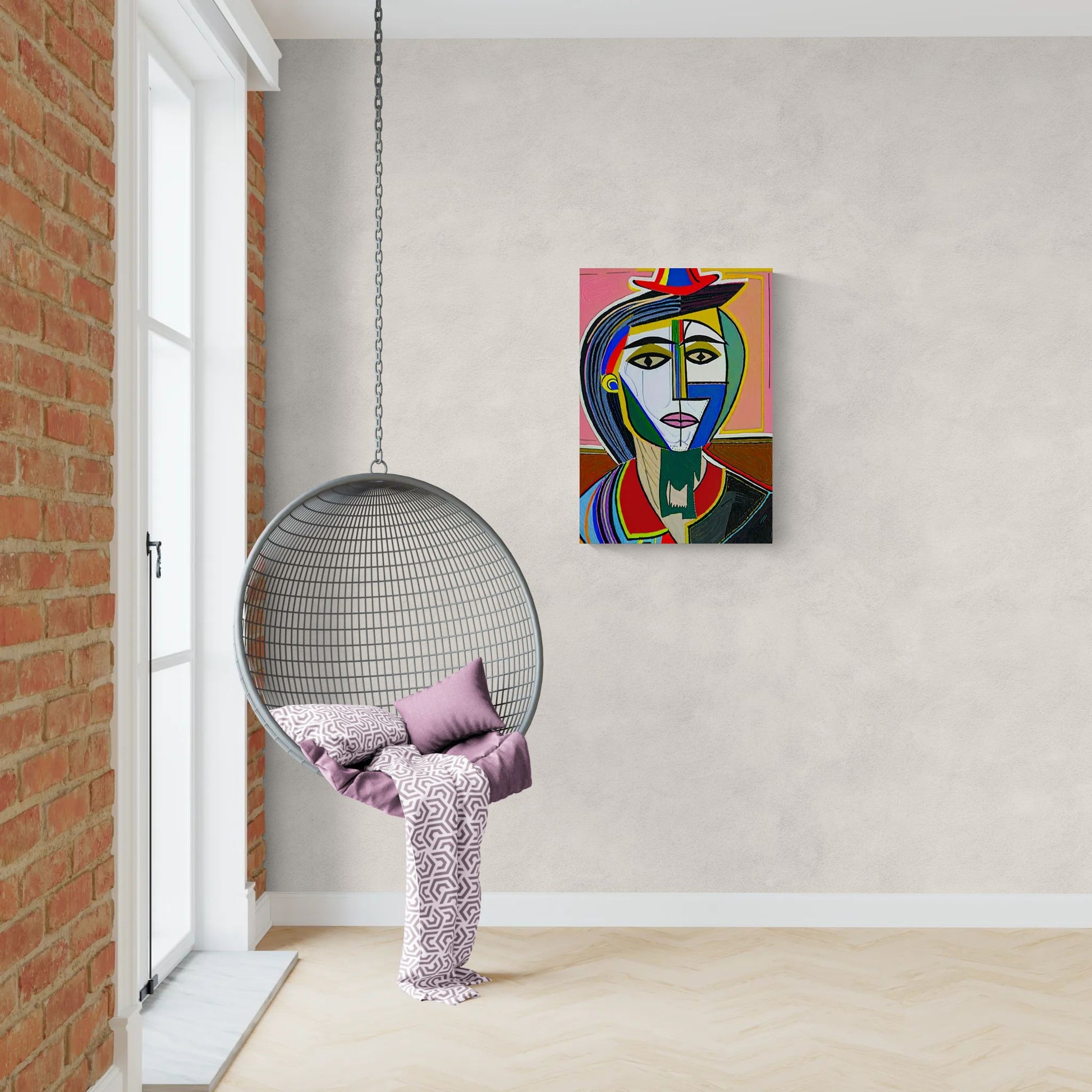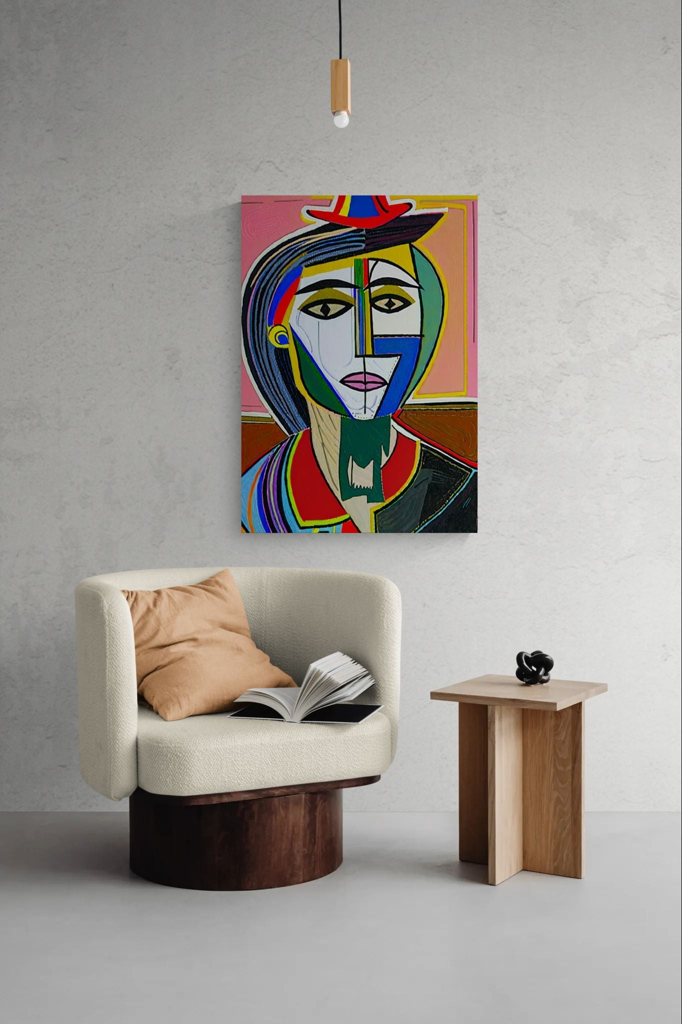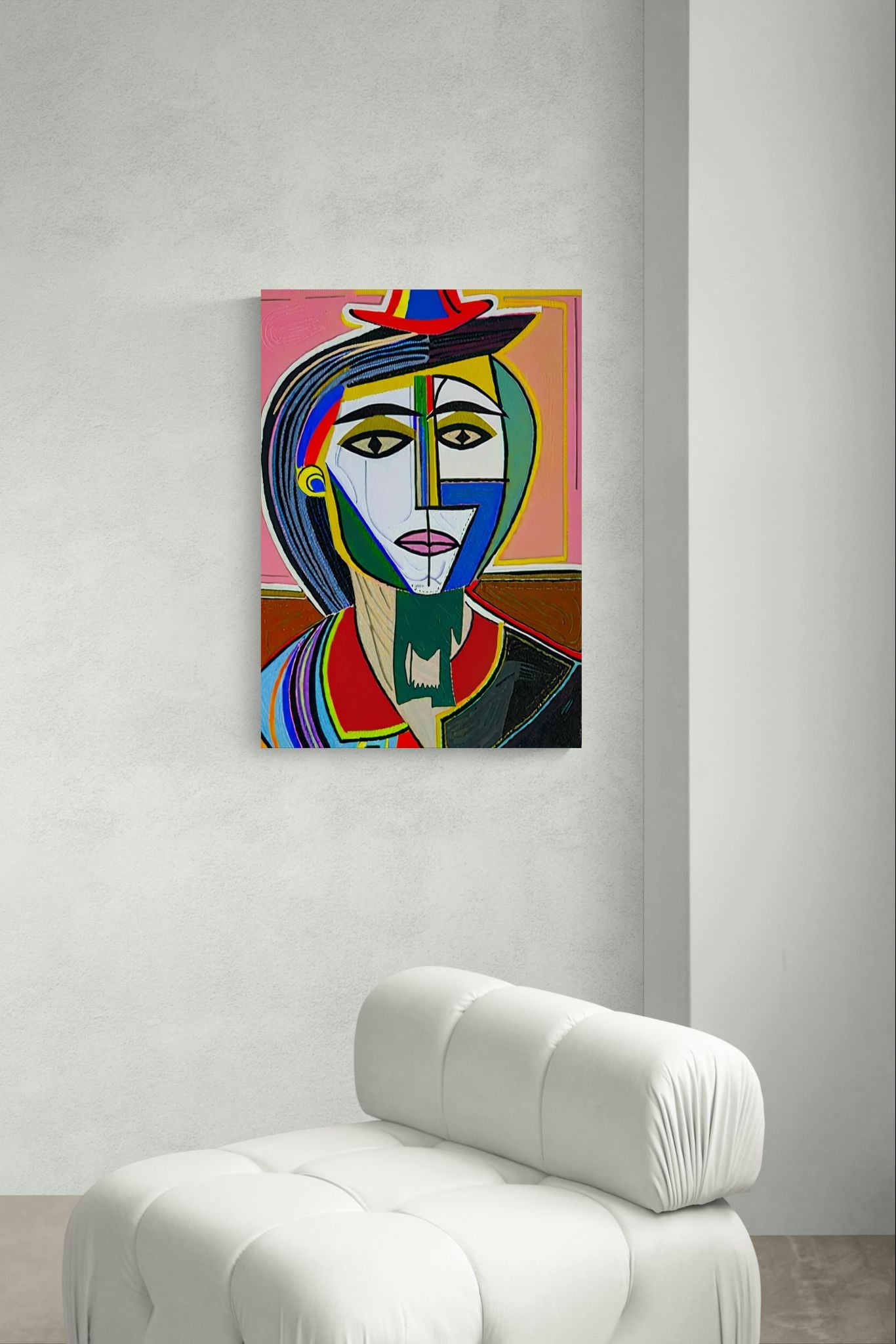 Et kraftfuldt kubistisk portræt, hvor den lille røde hat og de grafiske vifteformer omkring skuldrene tilfører en legende energi. De skarpe kantede skygger omkring øjnene giver figuren intensitet, mens farvevalget blander varme og kølige nuancer i perfekt balance. Et værk med tydelig modernistisk kant.