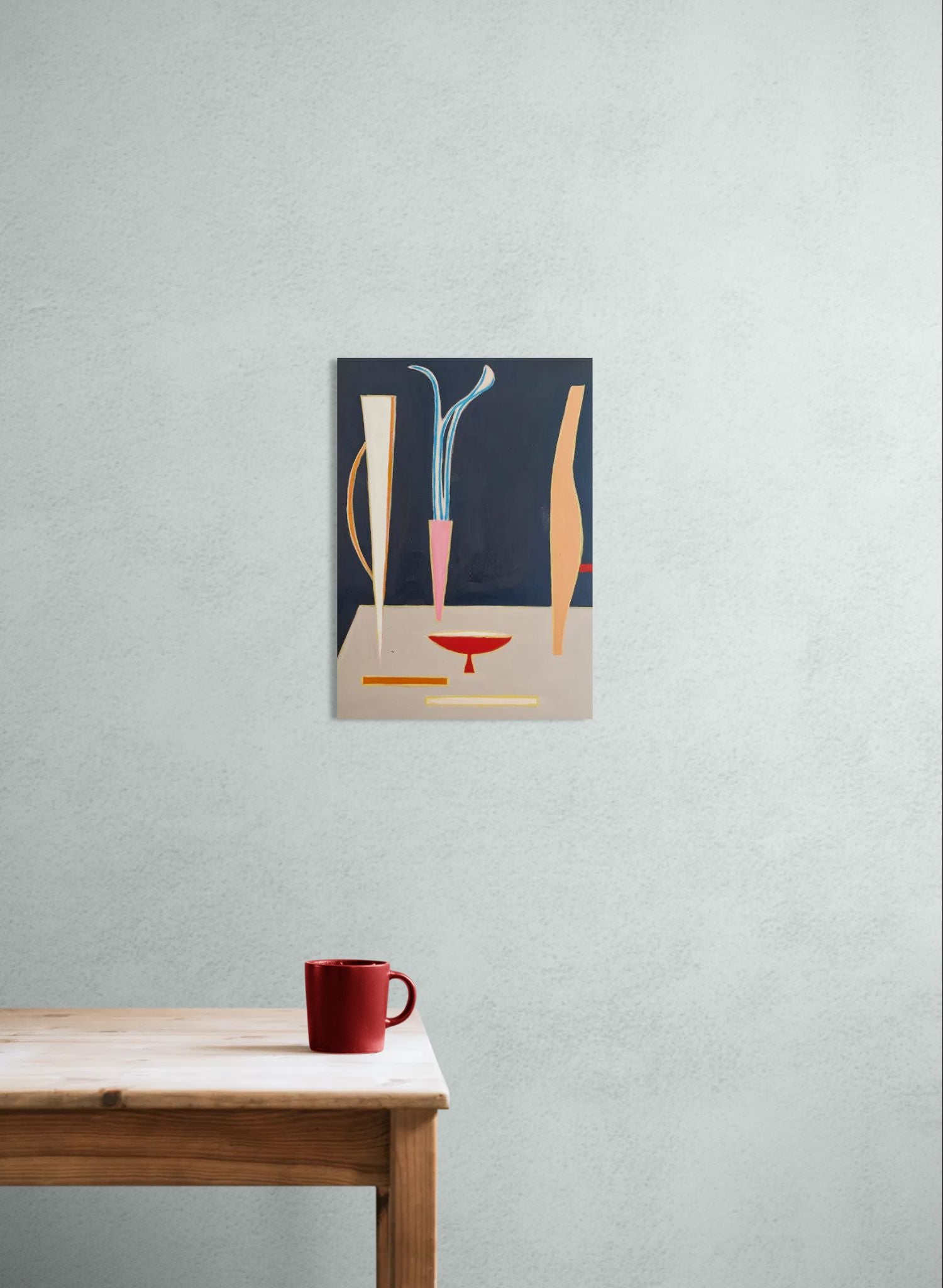 Et visuelt stramt og samtidig legende værk, hvor Tom Camden komponerer et stilleben i et spændingsfelt mellem balance og bevægelse. De vertikale elementer – fra den slanke hvide kande med orange kontur til de svungne blå blade i den pink vase – står i kontrast til bordets stabile flade og de horisontale stænger.