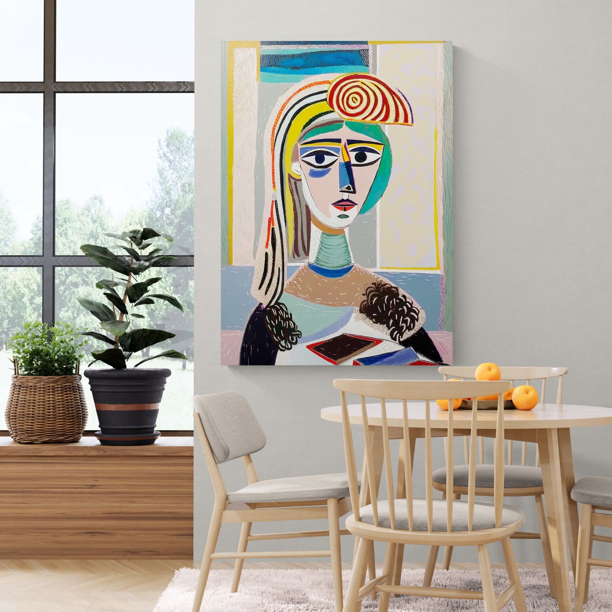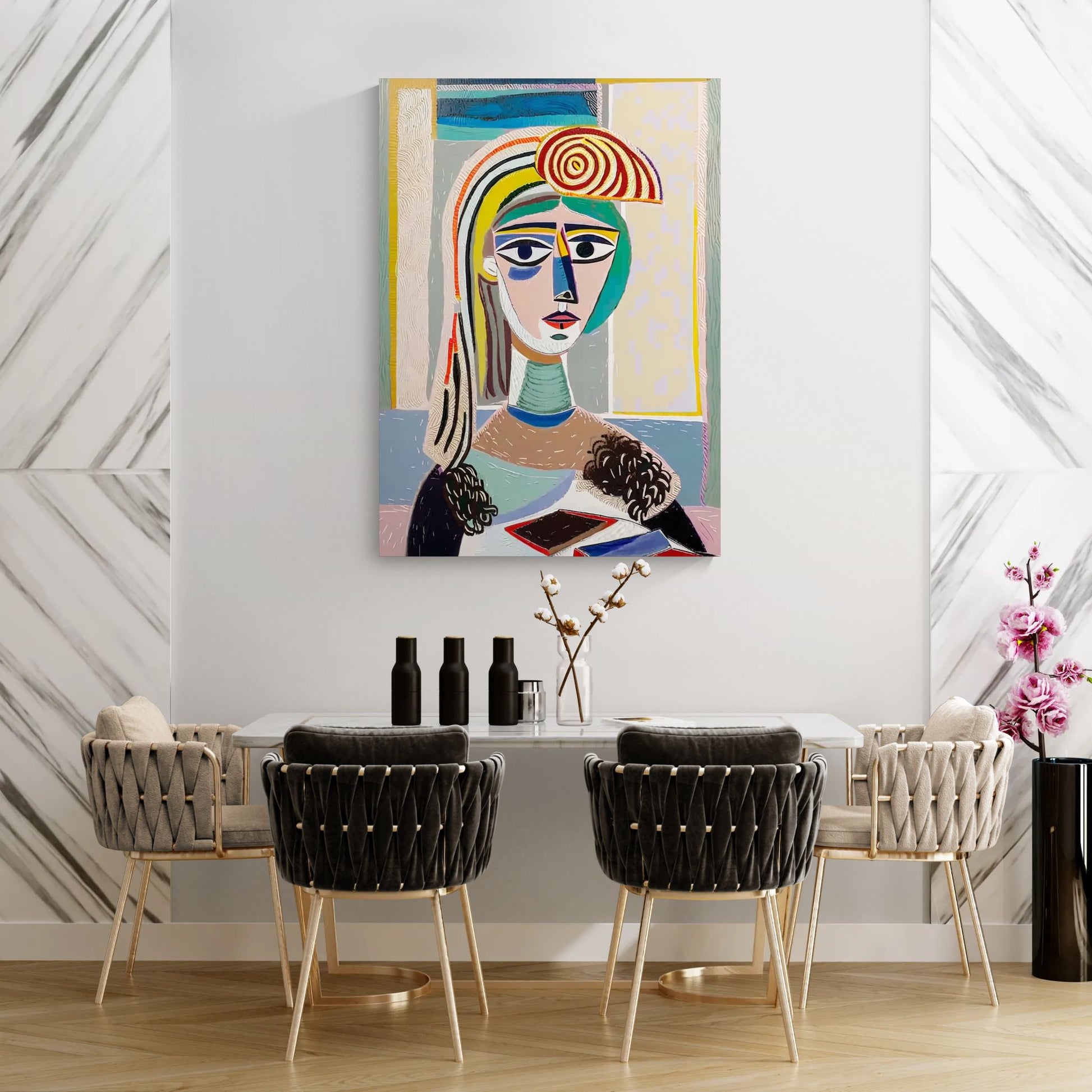 Et harmonisk og sanseligt portræt, hvor baggrundens mønstre og felter giver værket et rumligt, nærmest arkitektonisk udtryk. Den roterende spiral i håret fungerer som en farvemæssig kontrast til ansigtets kølige toner. Et afbalanceret og klassisk Camden-værk med moderne tekstur.