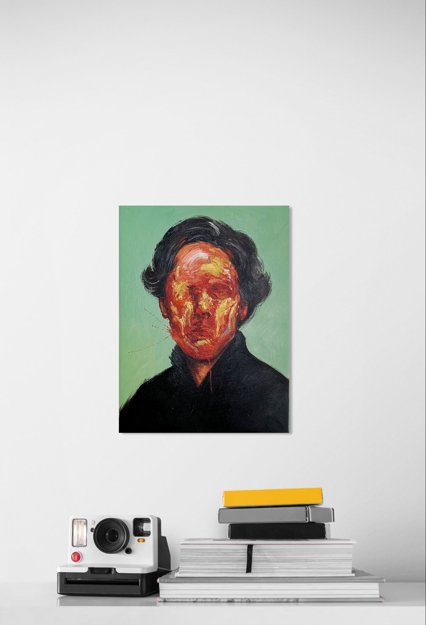 Et intenst blik ud gennem en maske af farve. Portrættets klassiske komposition nedbrydes af Van Norrs karakteristiske penselføring, hvor ansigtet gløder som et epicenter af følelser, vrede og uro. Huden er ikke gengivet – den er malet, vredet, vredet om igen, til kun maleriet selv står tilbage.