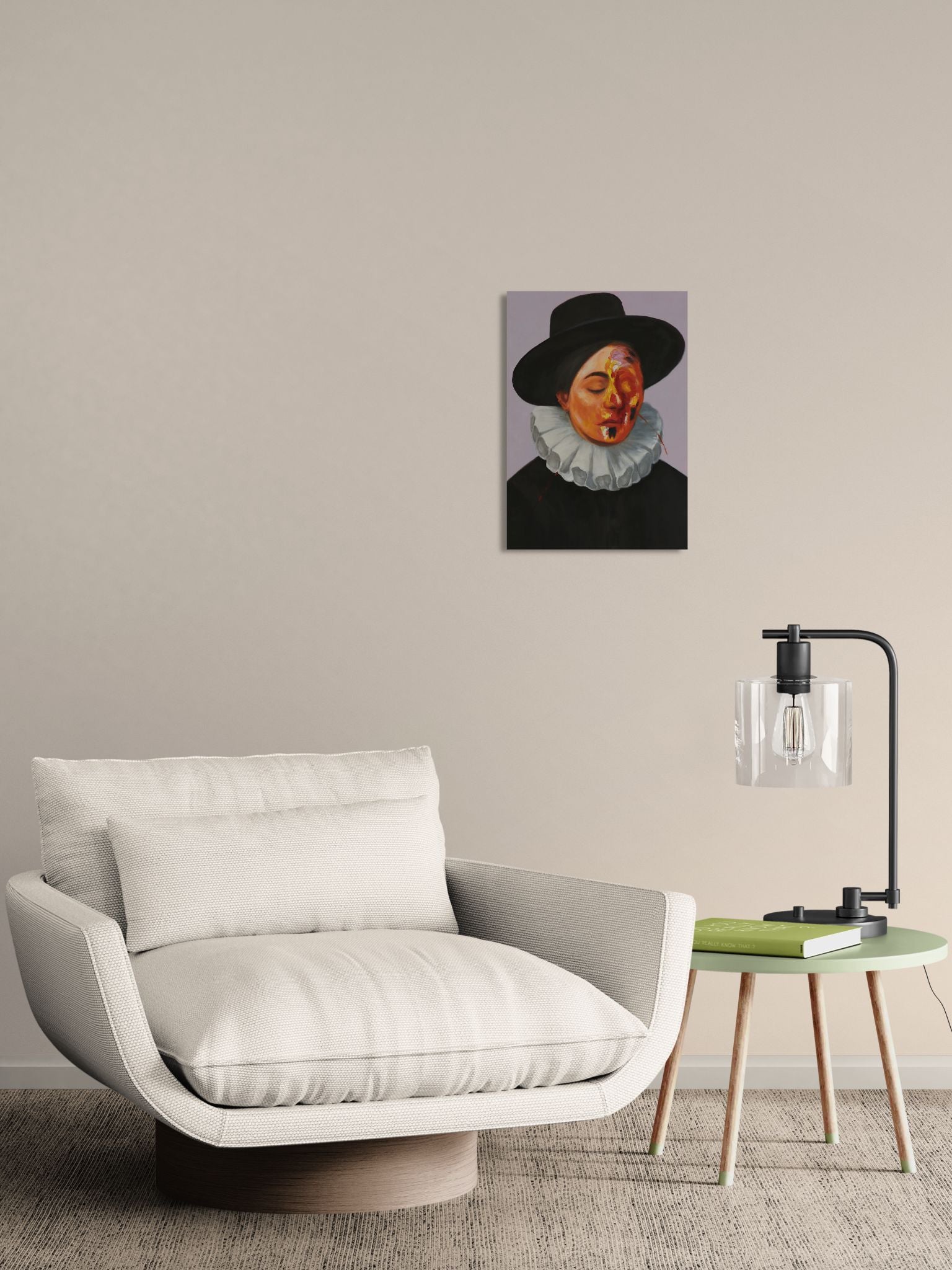 Et kvindeligt portræt med opsat hår og hvid krave, hvor ansigtet er forvredet af ildens penselstrøg. Lukkede øjne og et stille udtryk gør kontrasten endnu stærkere, som om hun accepterer ødelæggelsen. Det er et portræt af resignation, af stille styrke midt i opløsningen.