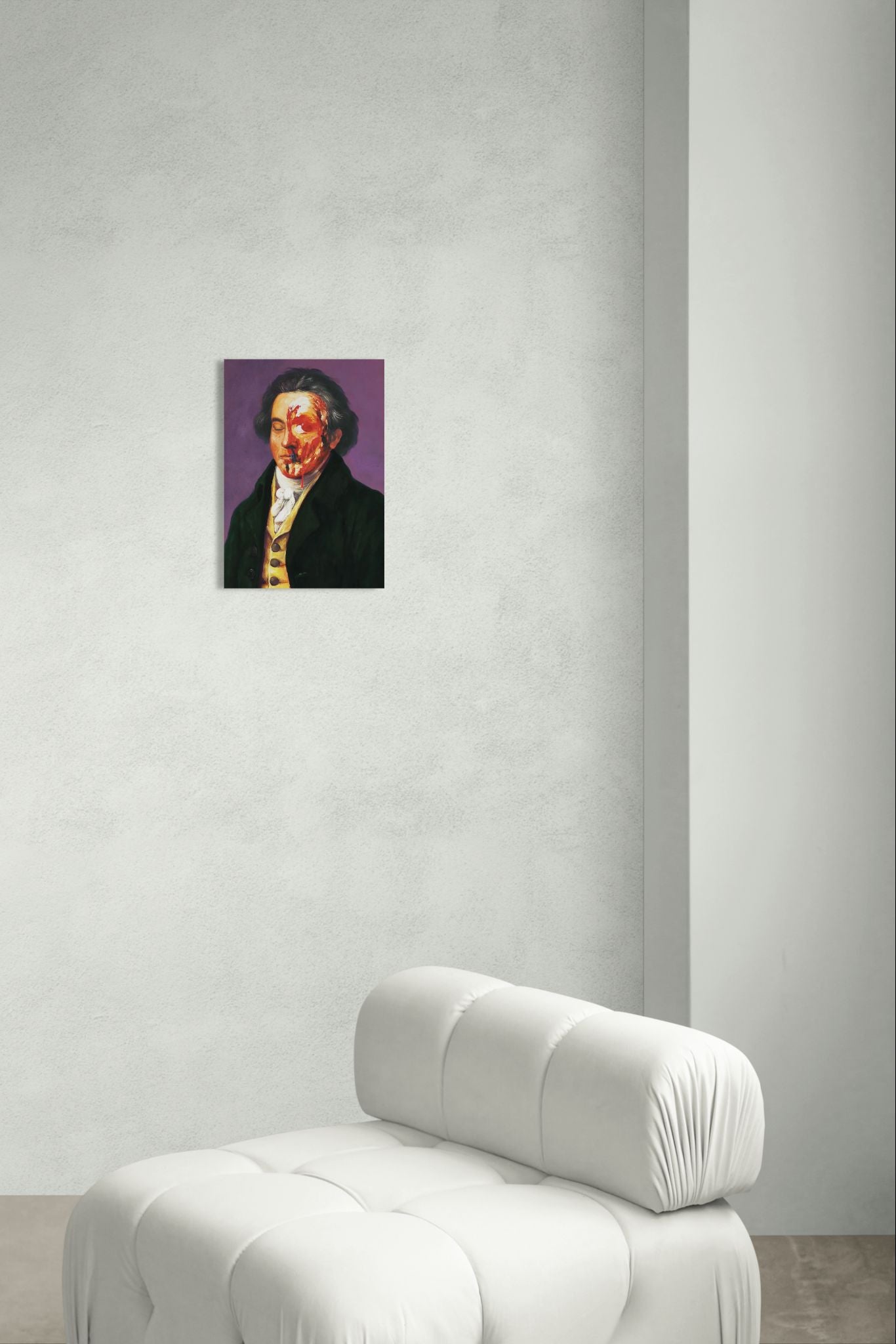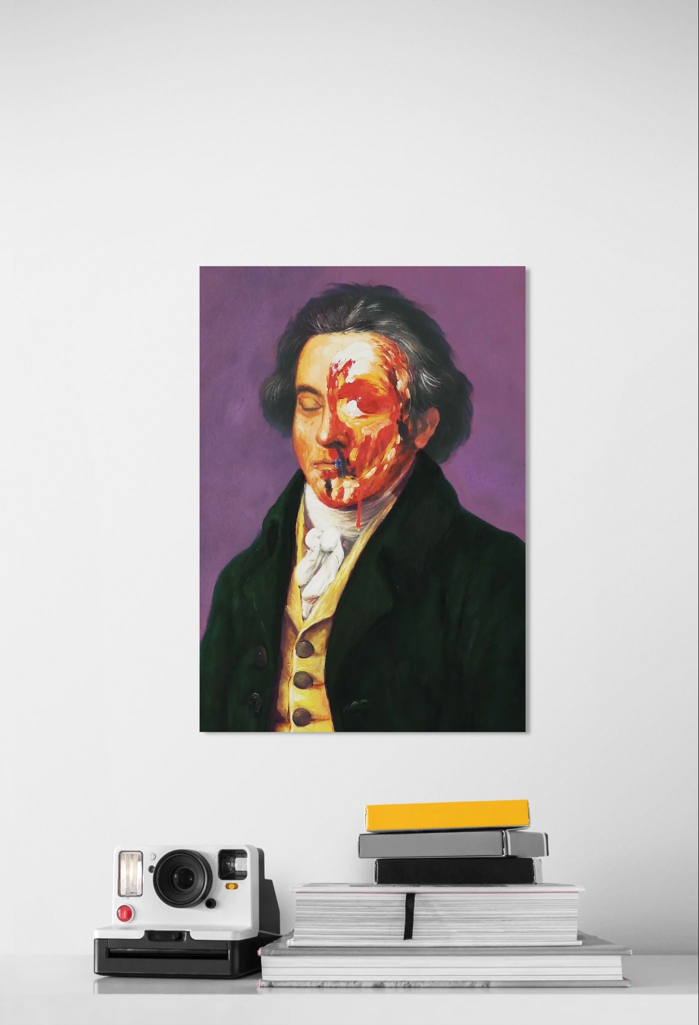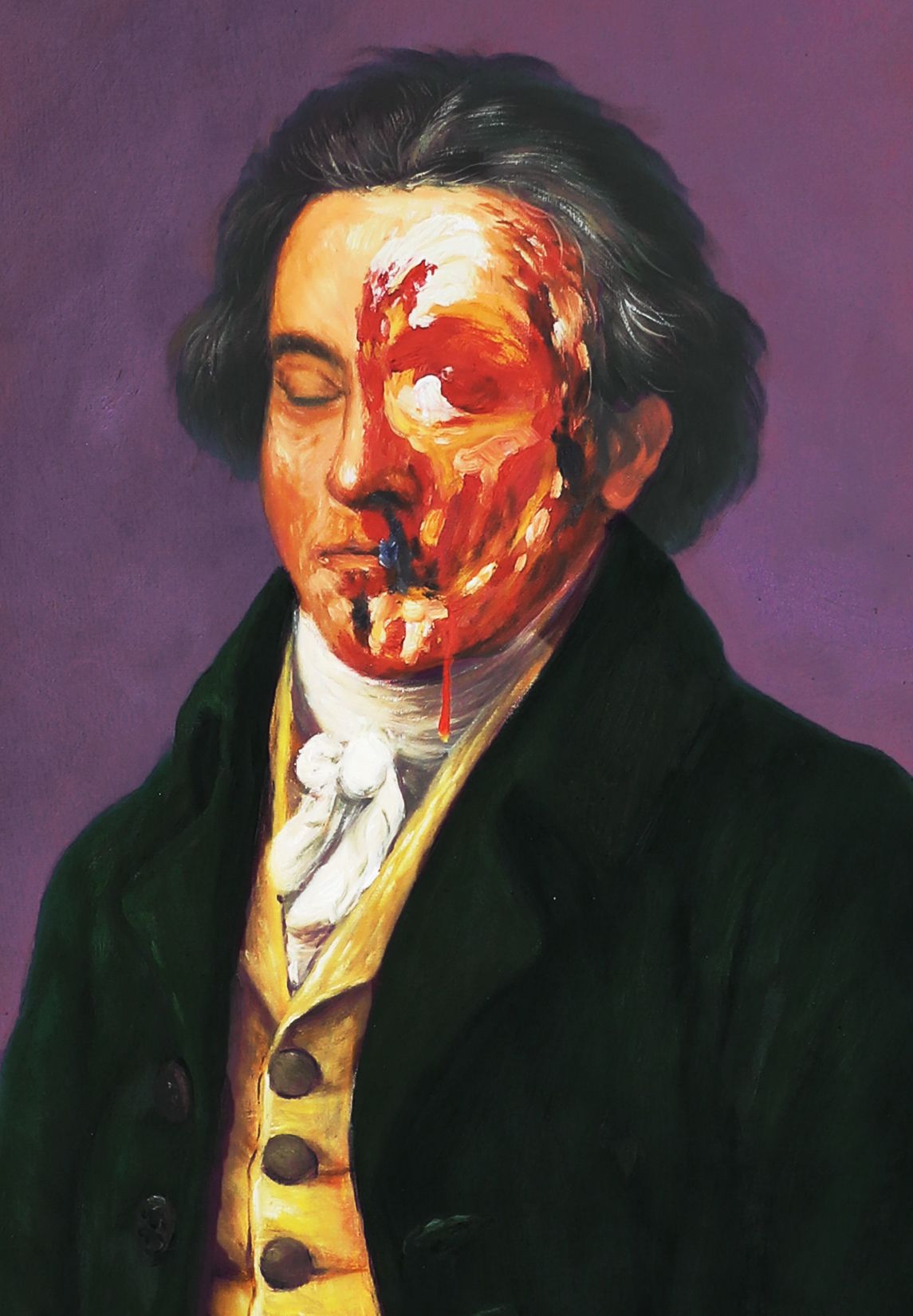 En figur med grøn frakke og klassisk hvide folder i tøjet står med lukkede øjne. Ansigtet er ødelagt, men der er en ro i udtrykket – som en martyr der har fundet fred i sit offer. De mørke og gyldne toner omkring kroppen skaber en næsten religiøs stemning.