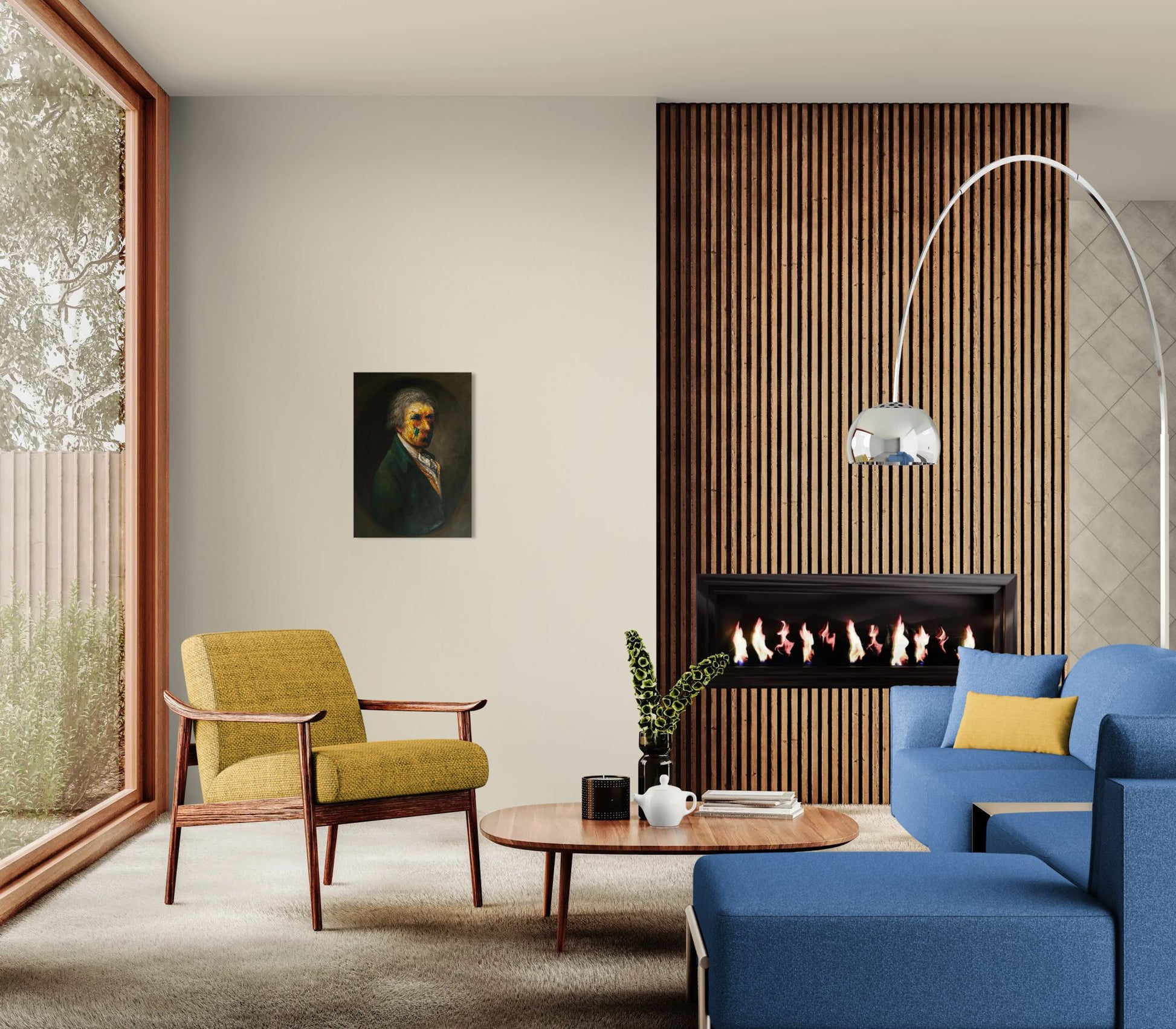 En klassisk oval portrætkomposition, hvor figuren i grøn frakke og hvid skjorte næsten kunne være hentet direkte fra 1700-tallet. Men ansigtet er blevet offer for malerens eksperiment, smadret og genopbygget i blå, gule og grønne klatter, der fremstår som ar på et vidne.