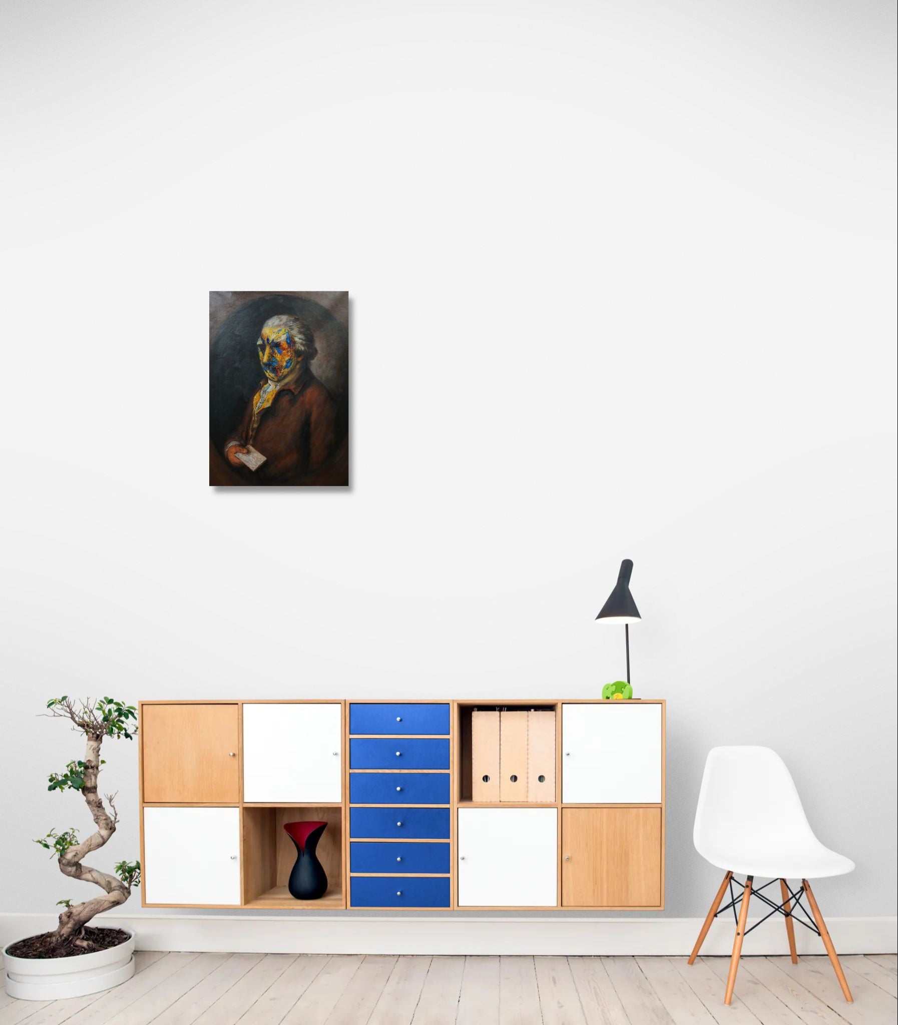 En mand med dokument i hånden, men uden et genkendeligt ansigt. Penselstrøgene i stærke primærfarver dækker hans træk, som om brevet bærer sandheden, han ikke selv længere kan udtrykke. Maleriet stiller spørgsmålet: hvad betyder et vidnesbyrd uden en stemme?