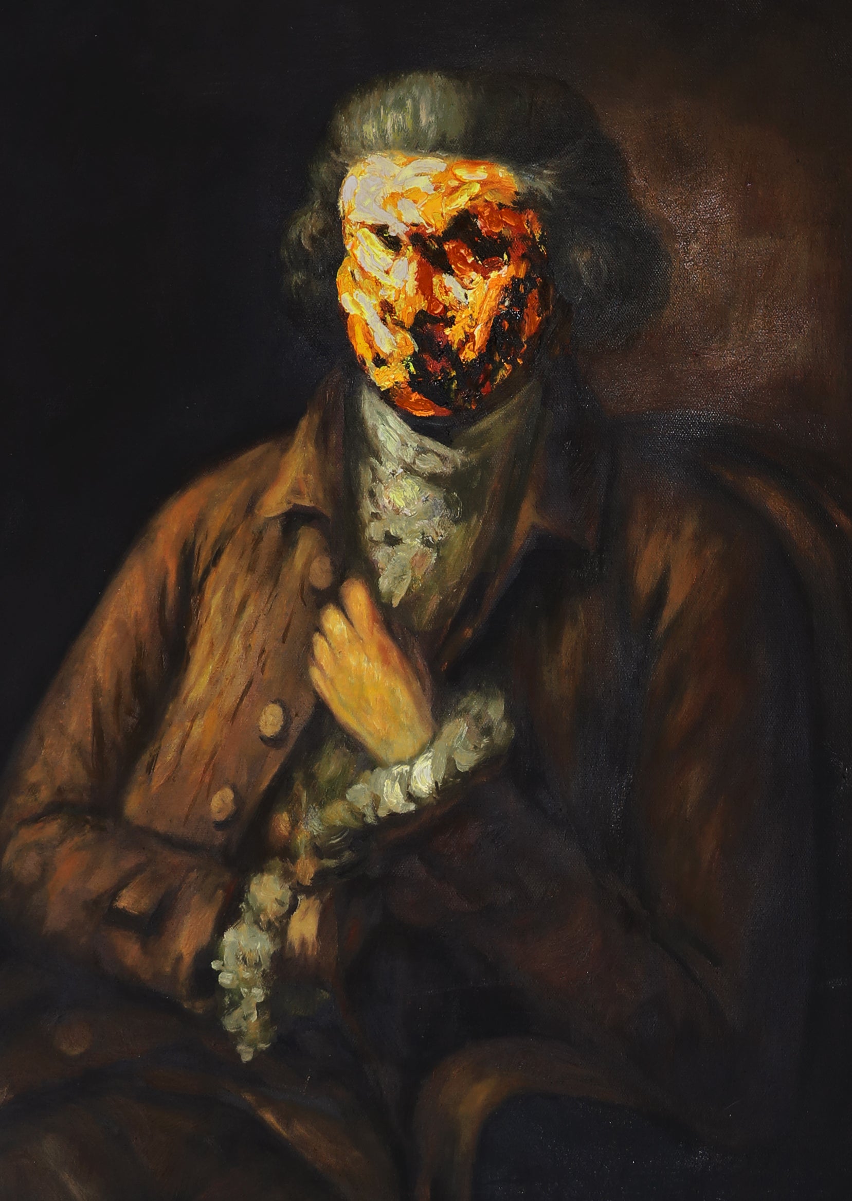 En figur læner sig tilbage i stolen, hånden hvilende mod brystet. Det kunne være en klassisk positur af selvsikkerhed, men ansigtet er reduceret til smeltede gule og sorte flager, næsten som kul.